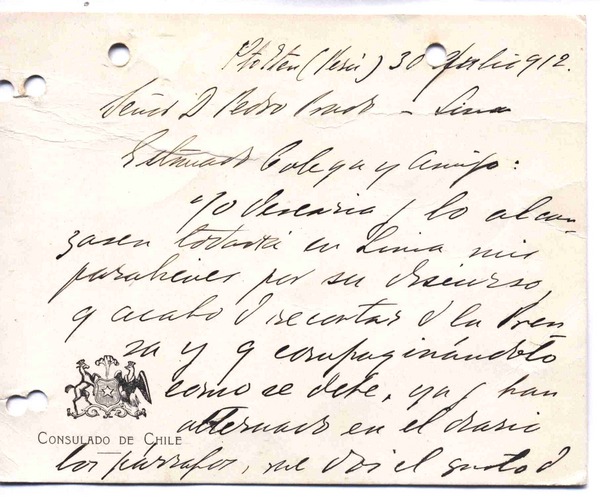 [Tarjeta] 1912 jul. 30, Eten, Perú [a] Pedro Prado [manuscrito] Augusto Thompson.