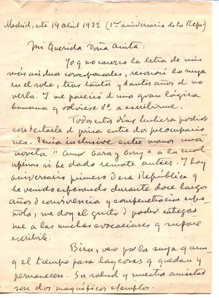 [Carta] 1932 abr. 14, Madrid, España [a] Anita vda. de Jordán [manuscrito] Augusto D'Halmar.