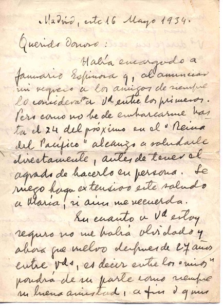 [Carta] 1934 mayo 16, Madrid, España [a] Armando Donoso [manuscrito] Augusto D'Halmar.