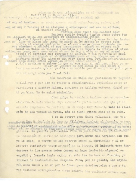 [Carta] 1934 mar. 23, Madrid, España [a] Francis de Miomandre [manuscrito] Augusto D'Halmar.