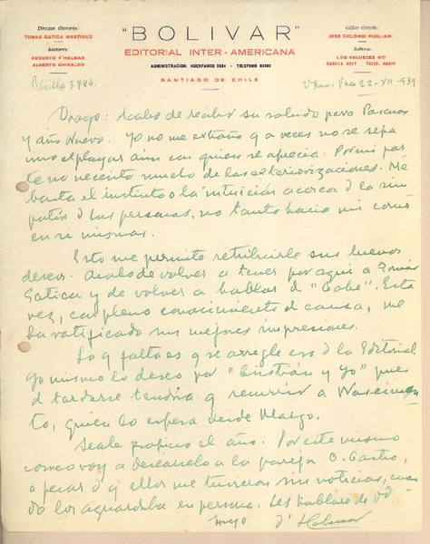 Valparaíso, Chile [a] Oscar Castro Carta, 1939 diciembre 27, [manuscrito] Augusto D'Halmar.