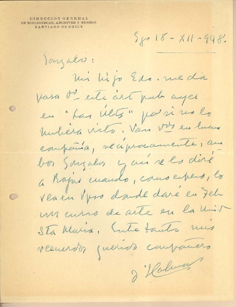 [Carta] 1948 dic. 18, Santiago, Chile [a] Gonzalo Drago [manuscrito] Augusto D'Halmar.
