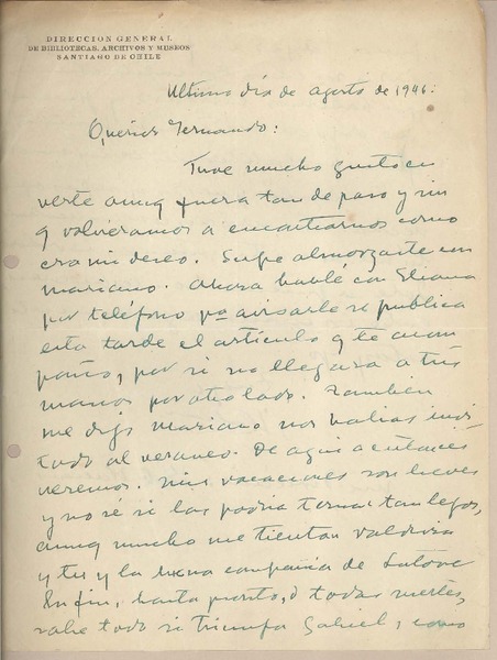 [Carta] 1946 agosto, Santiago, Chile [a] Fernando Santiván [manuscrito] Augusto D'Halmar.