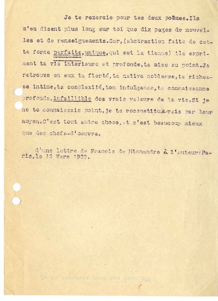 [Carta] 1929 marzo 12, París, Francia [a] Augusto D'Halmar [manuscrito] Francis de Miomandre; transcripción de Augusto D'Halmar.