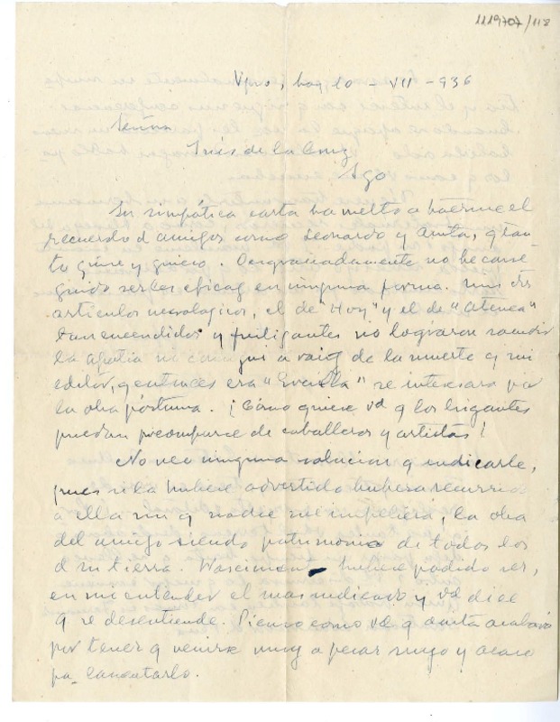 [Carta] 1936 julio 10, Santiago, Chile [a] Inés de la Cruz [Winett de Rokha] [manuscrito] Augusto D´Halmar.