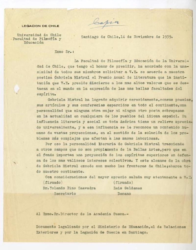 [Carta] 1940 ene. 30, Niza, [Francia] [al] Sr. D. Luis Galdames, Decano de la Facultad de Filosofía, Universidad de Chile, Santiago, [Chile] [manuscrito] Gabriela Mistral.