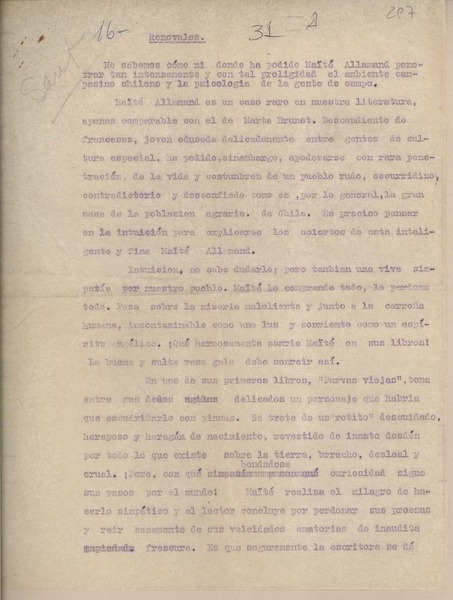 Renovales por Maité Allamand [manuscrito] Fernando Santiván.