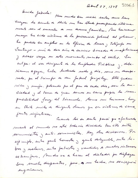 [Carta] 1948 abril 27, California [a] Gabriela Mistral [manuscrito] Fernando Alegría.