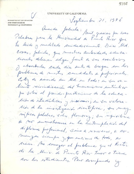 [Carta] 1948 sept. 21, California [a] Gabriela Mistral [manuscrito] Fernando Alegría.