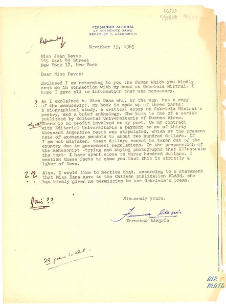 [Carta] 1963 Nov. 19, 55 Arlmonte Drive, Berkeley 7, California, [EE.UU.] [a] Miss Joan Daves, 145 East 49 Street, New York 17, New York, [EE.UU.] [manuscrito] Fernando Alegría.