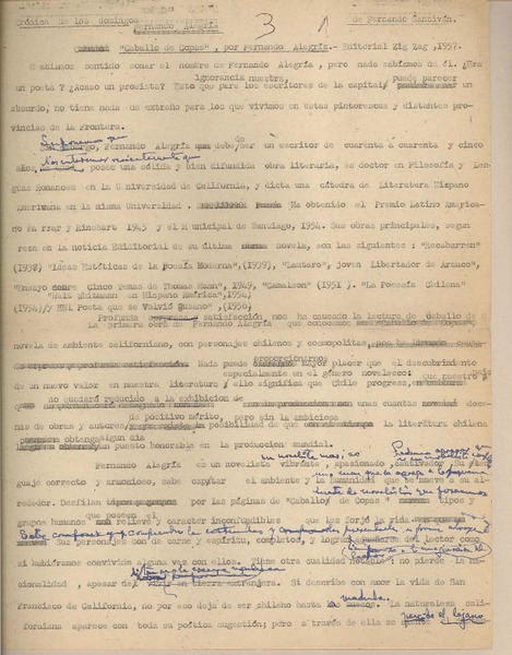 Caballo de copas - Manuscritos chilenos - Alegría, Fernando - Reseñas de libros