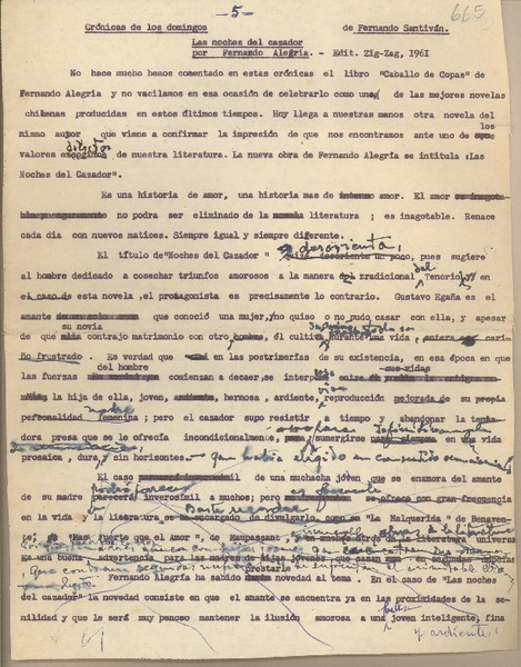 Noches del cazador - Manuscritos chilenos - Reseñas de libros - Alegría, Fernando