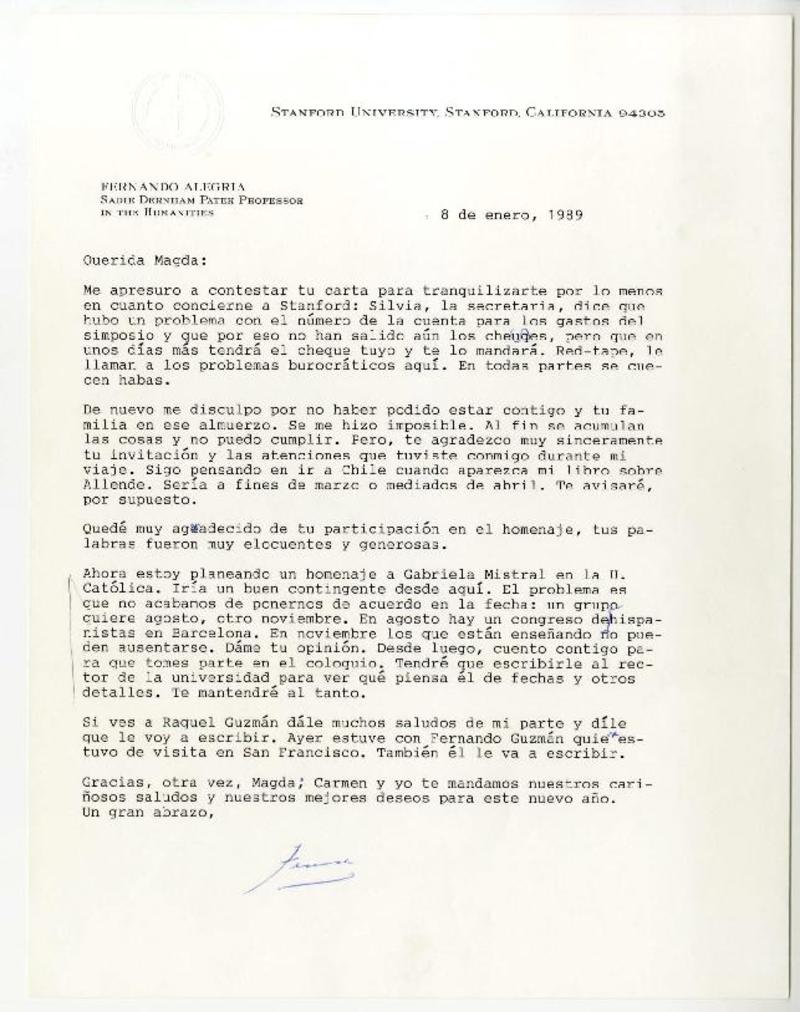 Stanford University, Estados Unidos [a] Magda Arce. carta, 1989 enero 8, [manuscrito] Fernando Alegrìa.