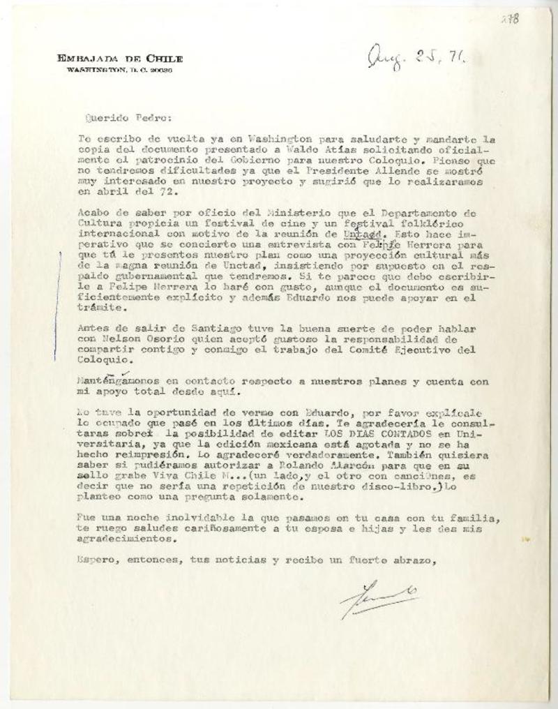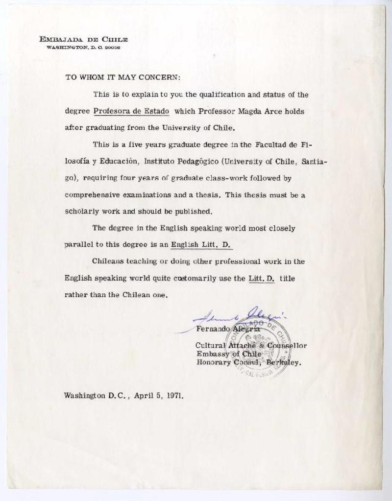 Santiago, Chile [a] Magda Arce. carta, 1971, [manuscrito] Fernando Alegria.