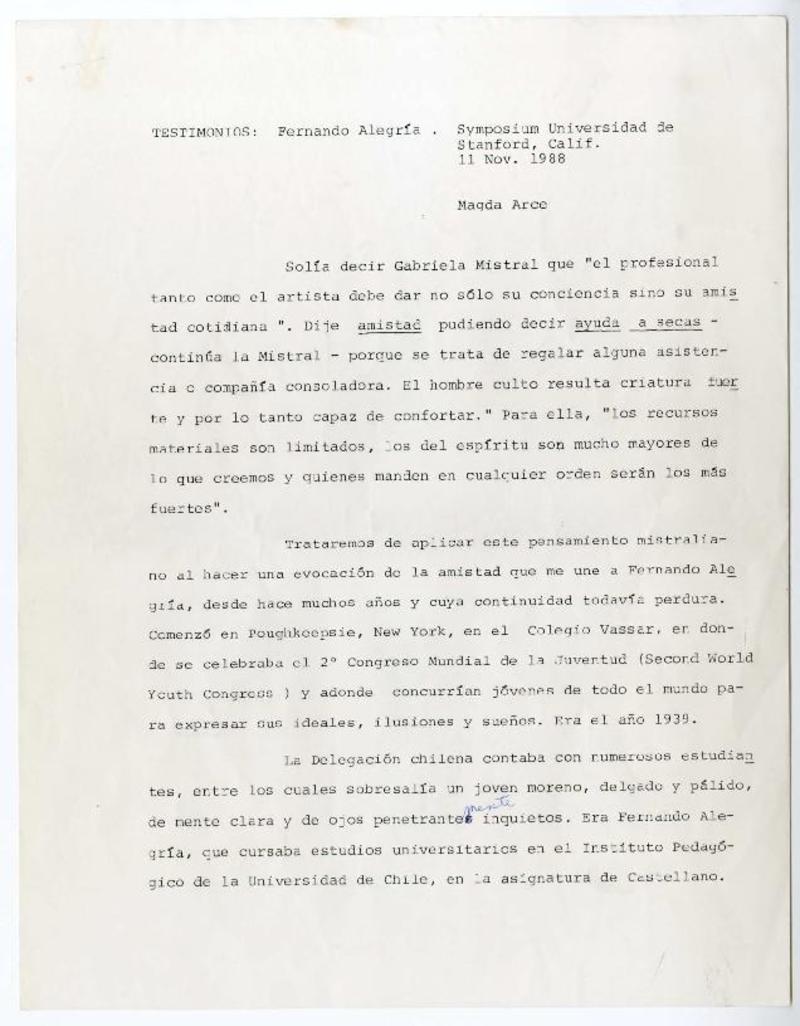Homenaje a Fernando Alegria [manuscrito] Magda Arce.