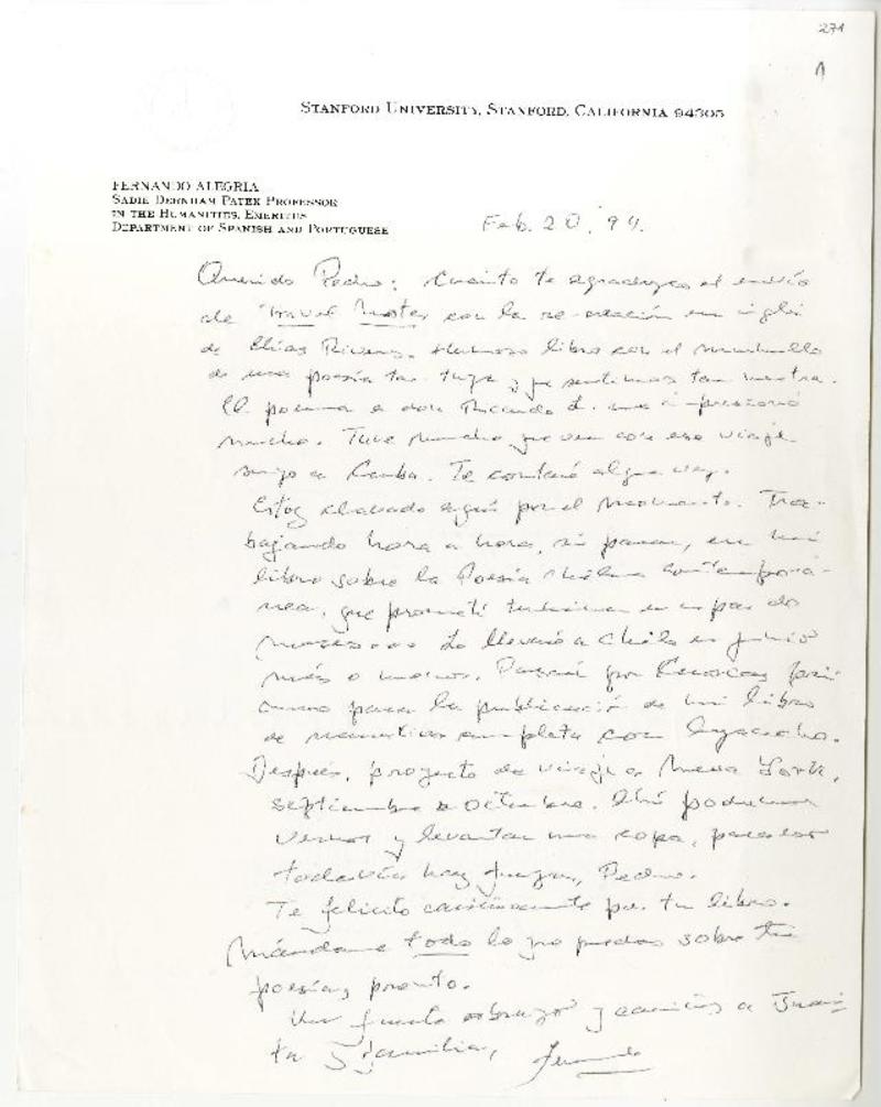 California [a] Pedro Lastra Carta, 20 de febrero 1994, [manuscrito] Fernando Alegría.
