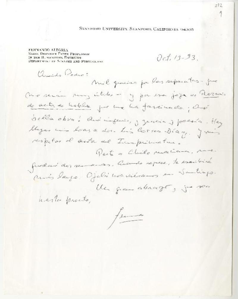 California [a] Pedro Lastra Carta, 13 de octubre 1993, [manuscrito] Fernando Alegría.