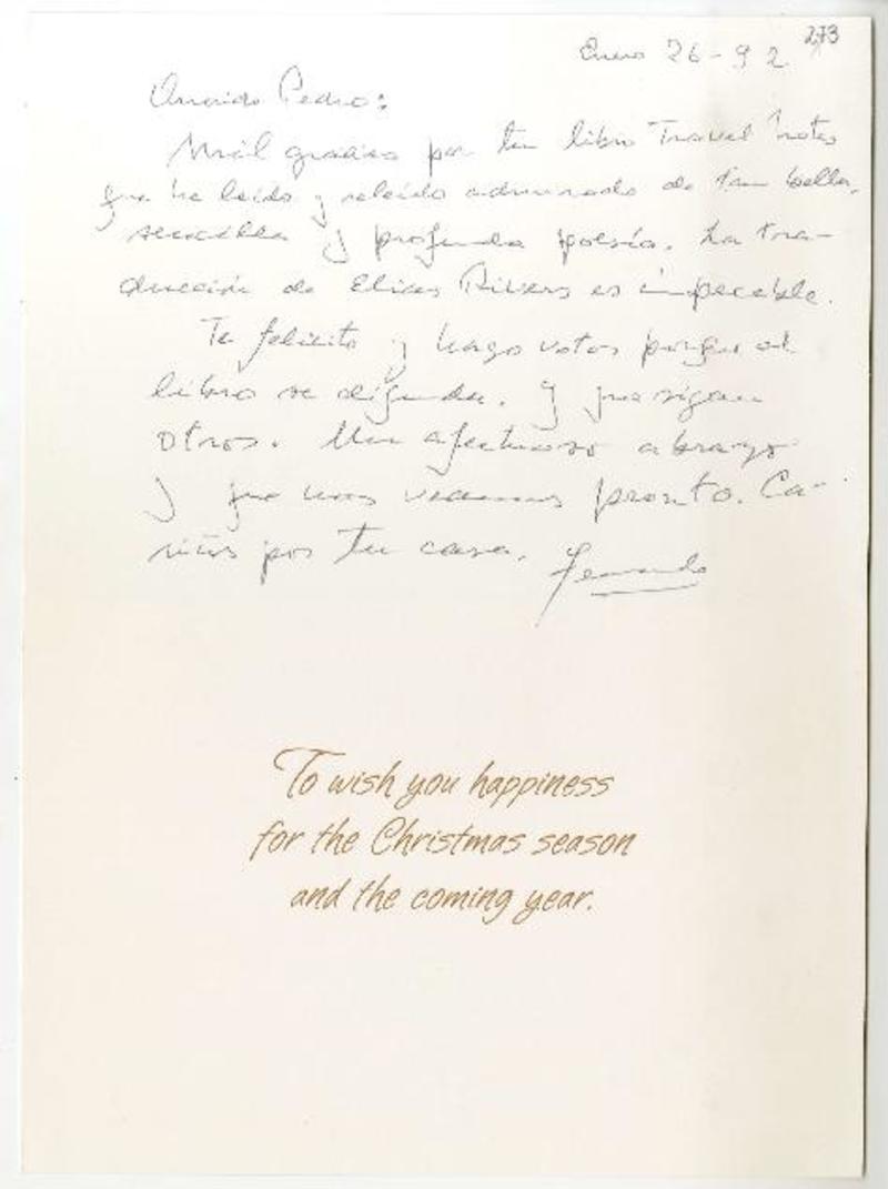 California [a] Pedro Lastra Tarjeta, 26 de enero 1992, [manuscrito] Fernando Alegría.