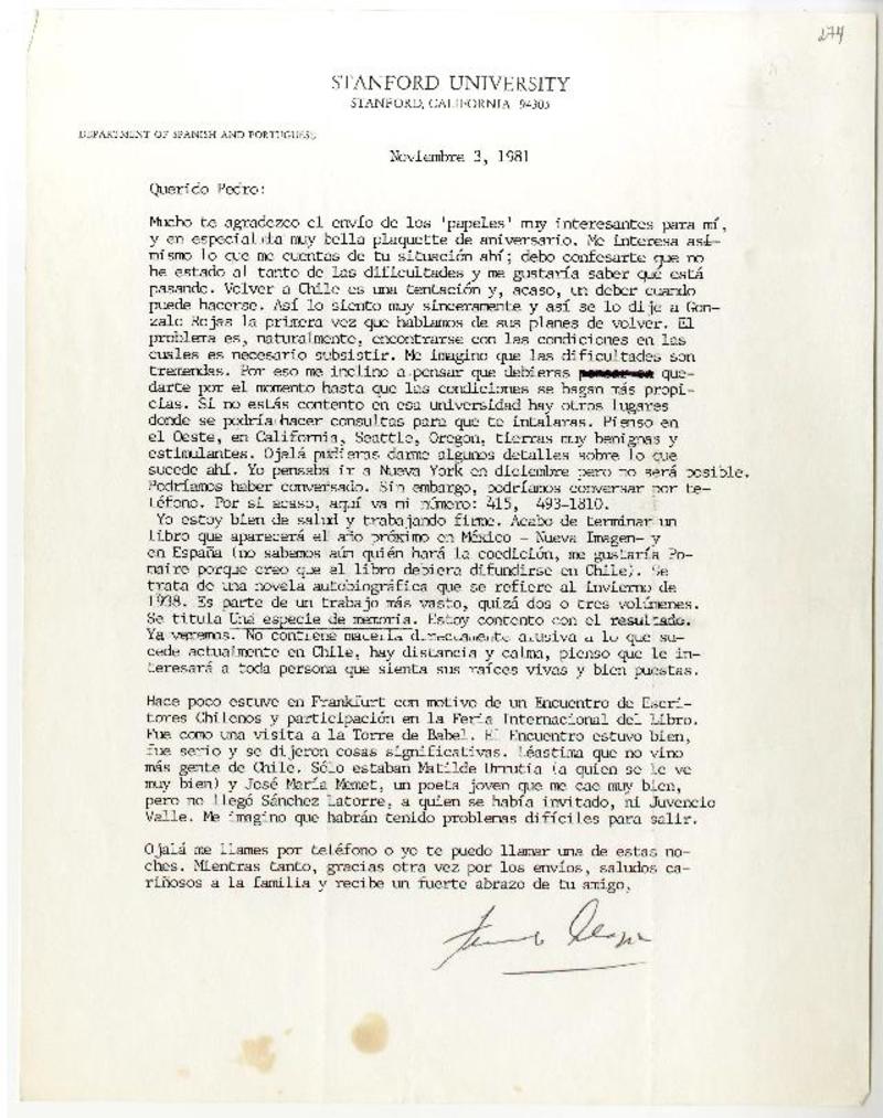 California [a] Pedro Lastra Carta, 31 de noviembre de 1981, [manuscrito] Fernando Alegría.