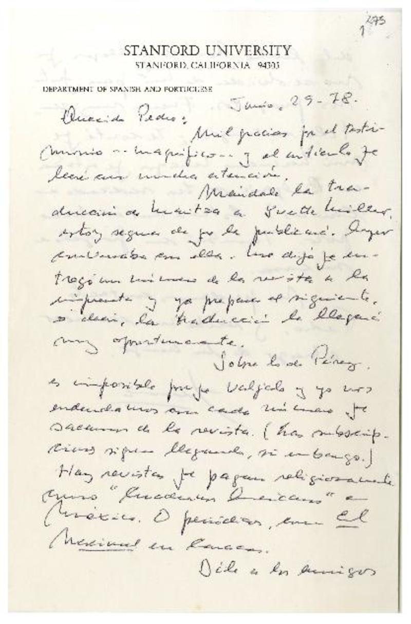 California [a] Pedro Lastra Carta, 29 de junio 1978, [manuscrito] Fernando Alegría.