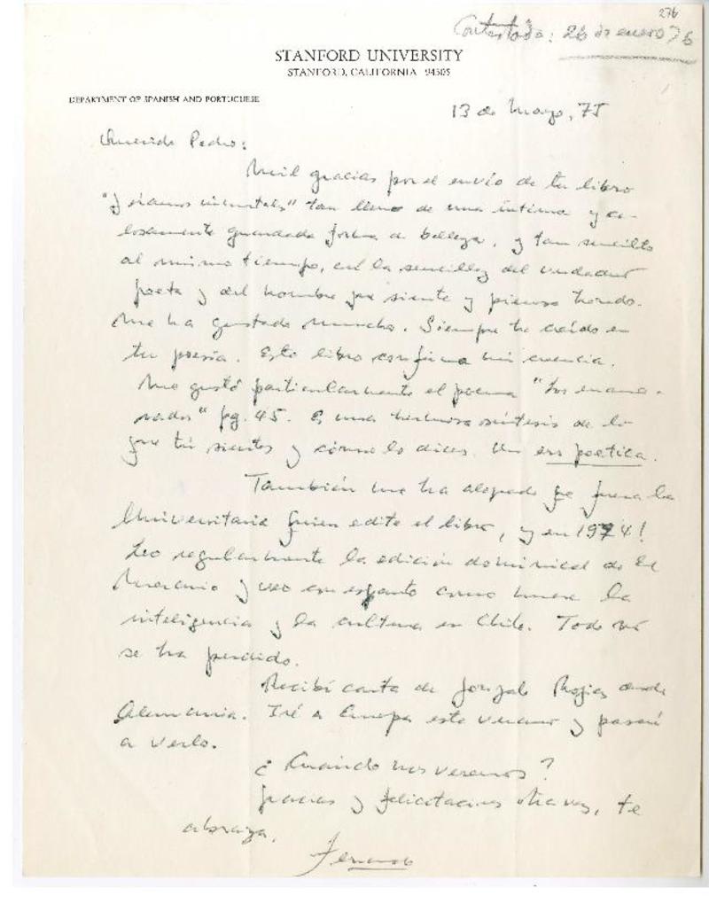 California [a] Pedro Lastra Carta, 13 de mayo 1975, [manuscrito] Fernando Alegría.