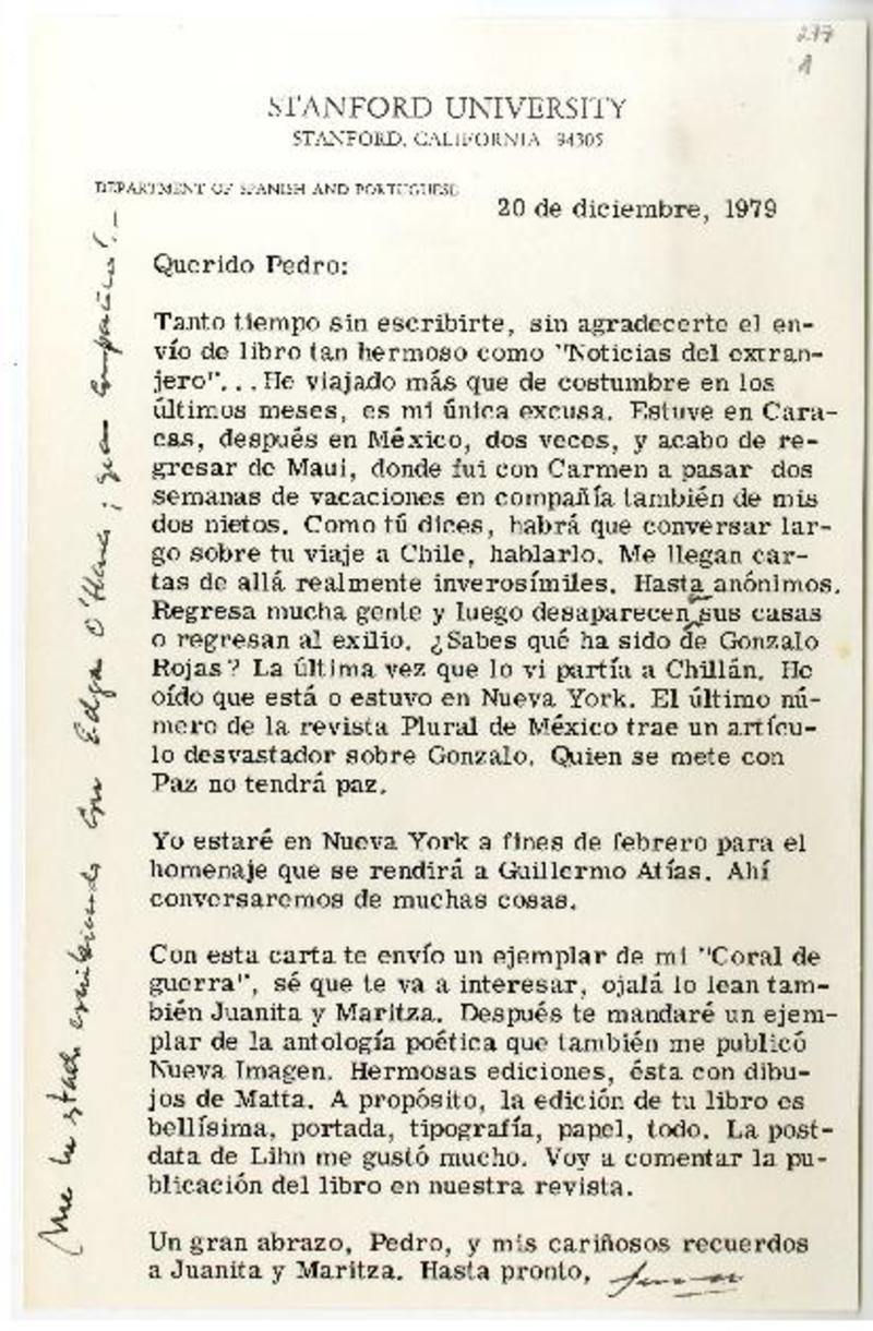 California [a] Pedro Lastra Carta, 20 de diciembre 1979, [manuscrito] Fernando Alegría.