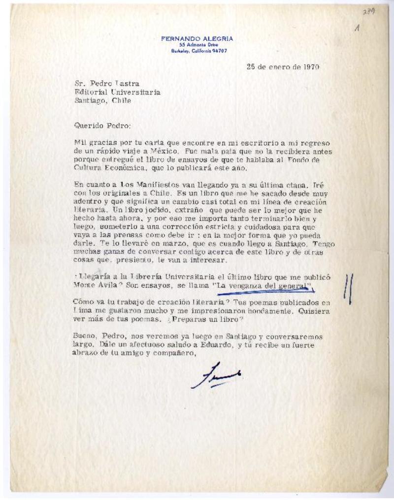 Berkeley, California [a] Pedro Lastra Carta, 25 de enero 1970, [manuscrito] Fernando Alegría.