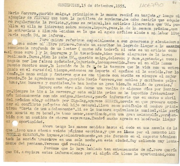 Concepción, Chile [a] Mario Ferrero Carta, 1955 diciembre 15, [manuscrito] Daniel Belmar.