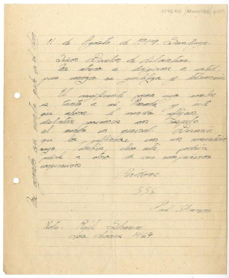 Santiago, Chile [a] Mario Ferrero Carta, 1949 agosto 11, [manuscrito] Raúl Sharim Paz.