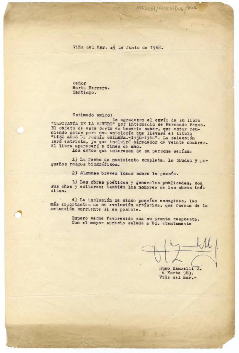 Viña del Mar, Chile [a] Mario Ferrero Carta, 1948 junio 29, [manuscrito] Hugo Zambelli.