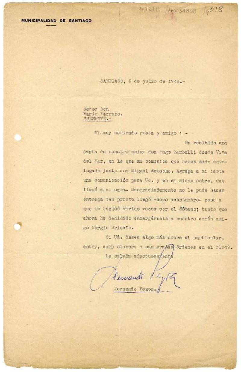 Santiago, Chile [a] Mario Ferrero Carta, 1948 julio 9, [manuscrito] Fernando Pezoa.