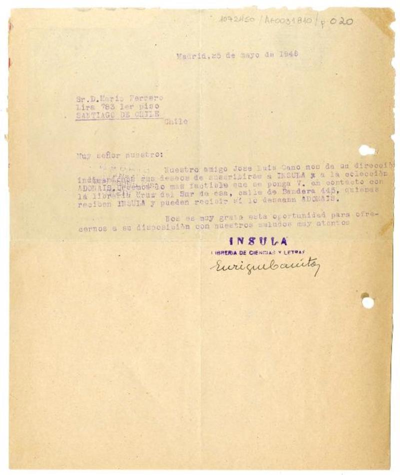 Madrid, España [a] Mario Ferrero, santiago, Chile Carta, 1948 mayo 20, [manuscrito] José Luis Cano.