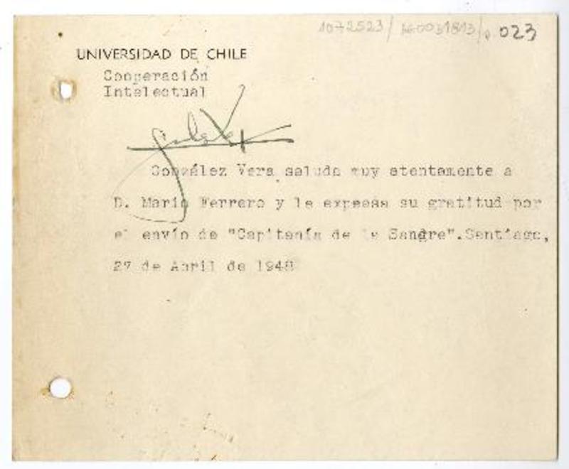 Santiago, Chile [a] Mario Ferrero Tarjeta, 1948 abril 27, [manuscrito] José Santos González Vera.