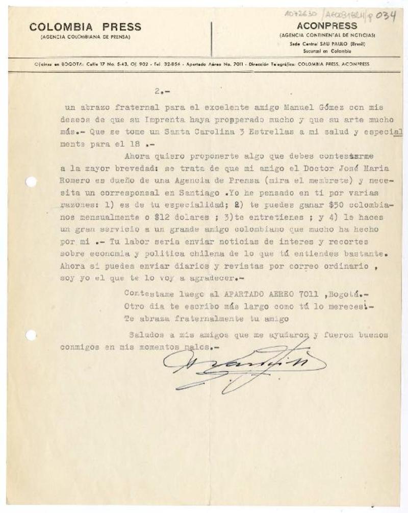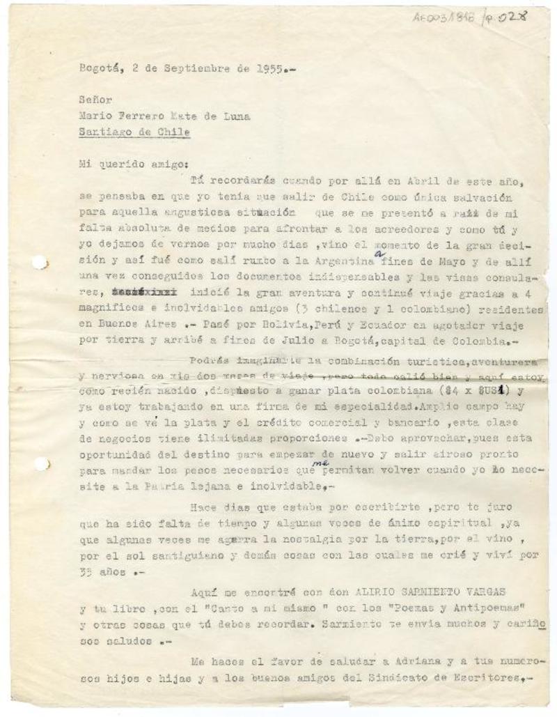 Bogotá, Colombia [a] Mario Ferrero Carta, 1955 septiembre 2, [manuscrito] Enrique Arancibia Figueroa.