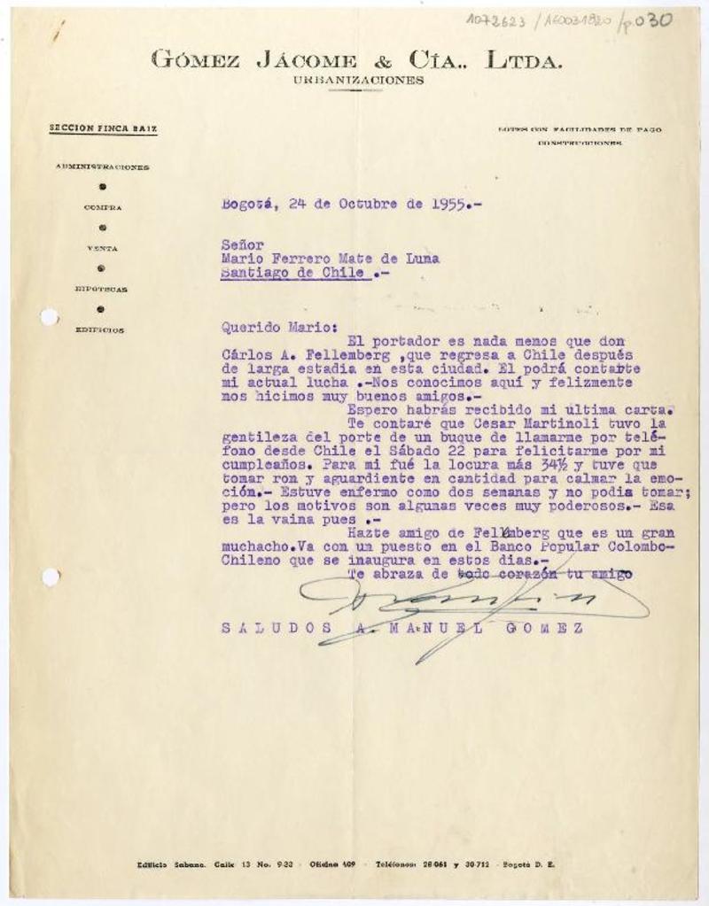 Bogotá, Colombia [a] Mario Ferrero Carta, 1955 octubre 24, [manuscrito] Enrique Arancibia Figueroa.