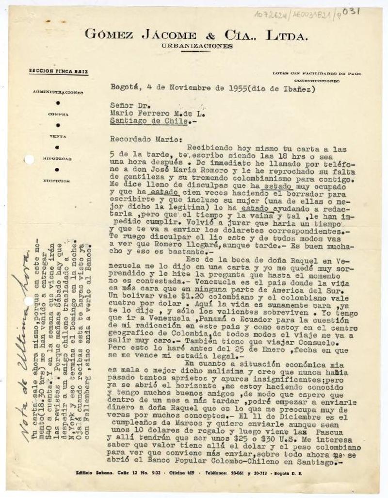 Bogotá, Colombia [a] Mario Ferrero Carta, 1955 noviembre 4, [manuscrito] Enrique Arancibia Figueroa.