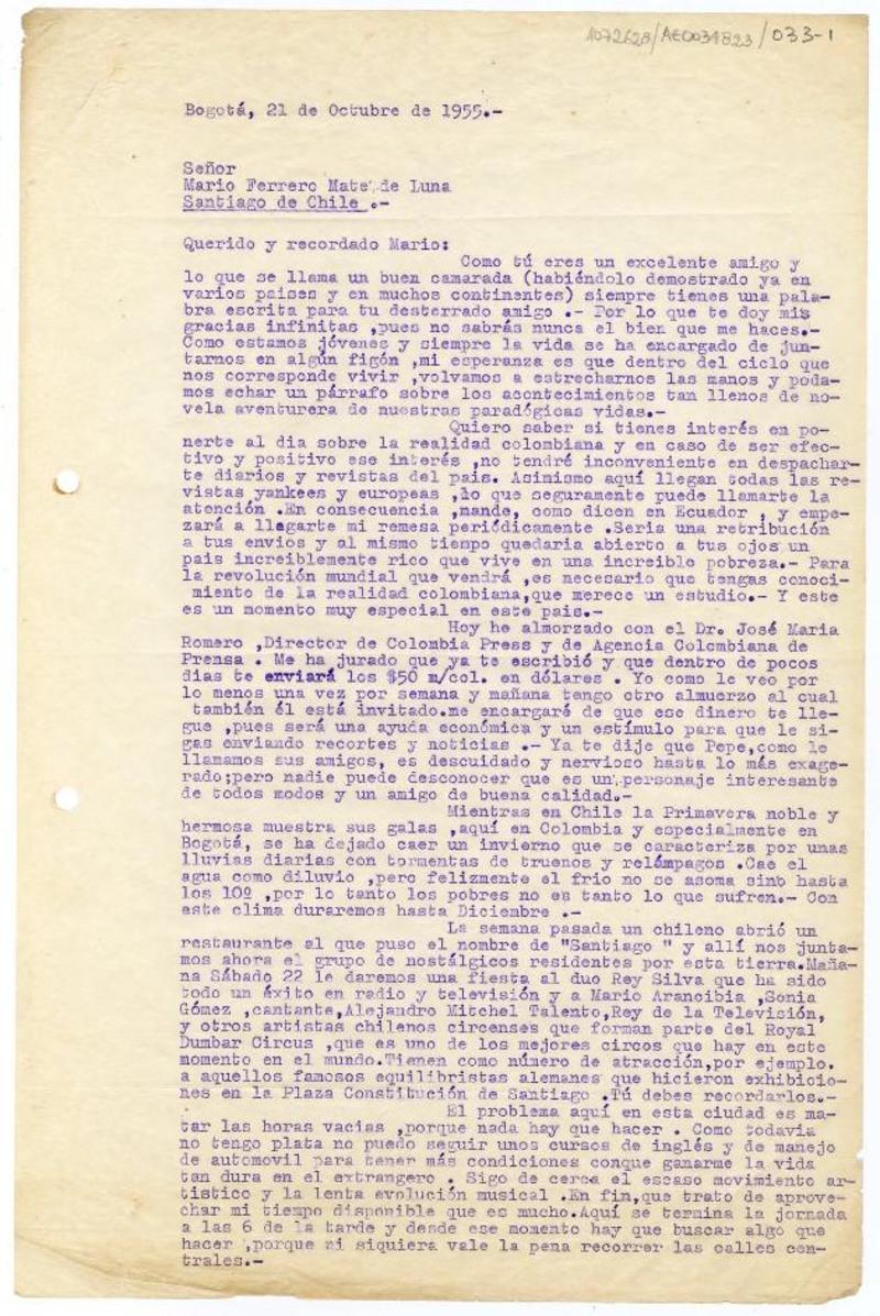 Bogotá, Colombia [a] Mario Ferrero Carta, 1955 octubre 21, [manuscrito] Enrique Arancibia Figueroa.