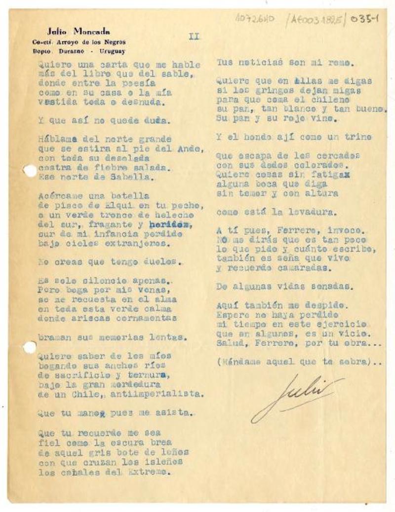 Moncada, Julio - Correspondencia - Autores chilenos - Manuscritos chilenos - Ferrero, Mario