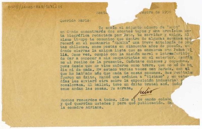 Montevideo, Uruguay [a] Mario Ferrero Carta, 1956 junio 25, [manuscrito] Julio Moncada.