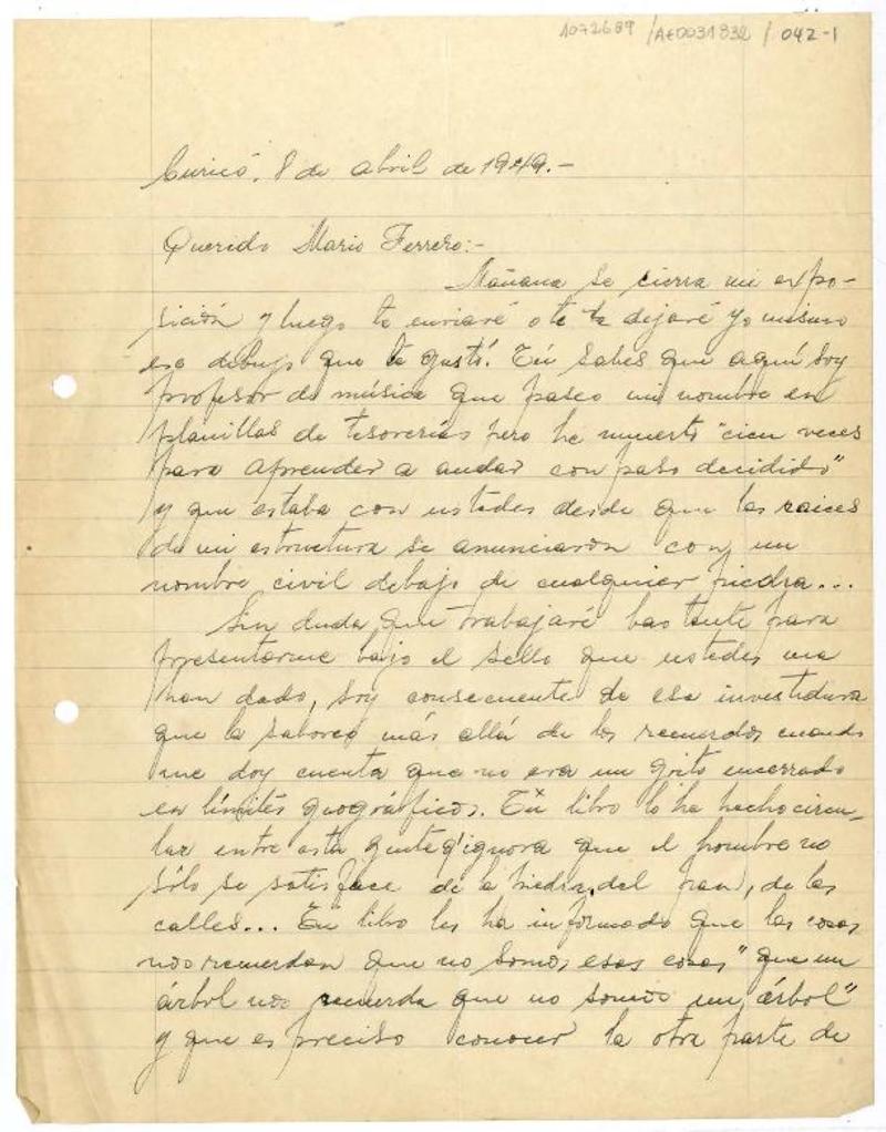 Curicó, Chile [a] Mario Ferrero Carta, 1949 abril 8, [manuscrito] Héctor Pino Martínez.