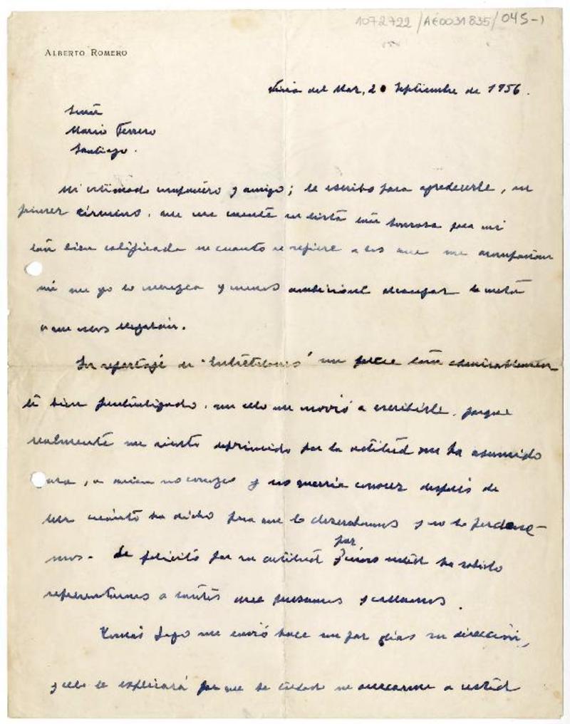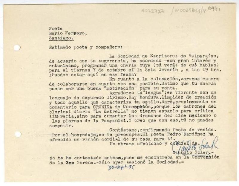 Santiago, Chile [a] Mario Ferrero Carta, 1955 septiembre 30, [manuscrito] Claudio Solar.