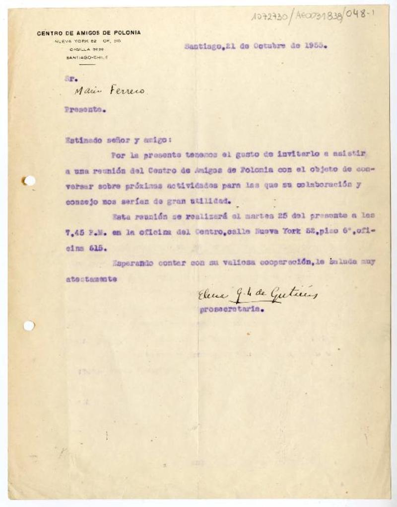 Santiago, Chile [a] Mario Ferrero Carta, 1955 octubre 21, [manuscrito] Helena G. H. de Gutiérrez.