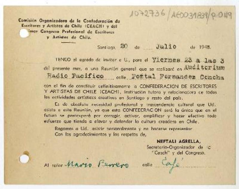 Santiago, Chile [a] Mario Ferrero Tarjeta, 1948 julio 20, [manuscrito] Neftalí Agrella.