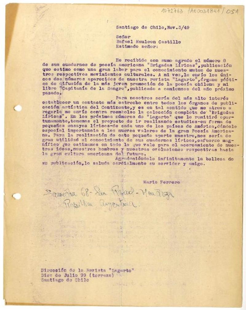 Santiago, Chile [a] Rafael Mauleon Castillo, Buenos Aires, Argentina Carta, 1949 noviembre 3, [manuscrito] Mario Ferrero.