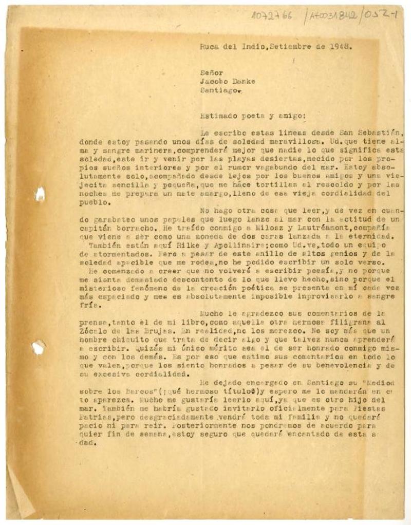 San Sebastián, Chile [a] Jacobo Danke Carta, 1948 septiembre, [manuscrito] Mario Ferrero.