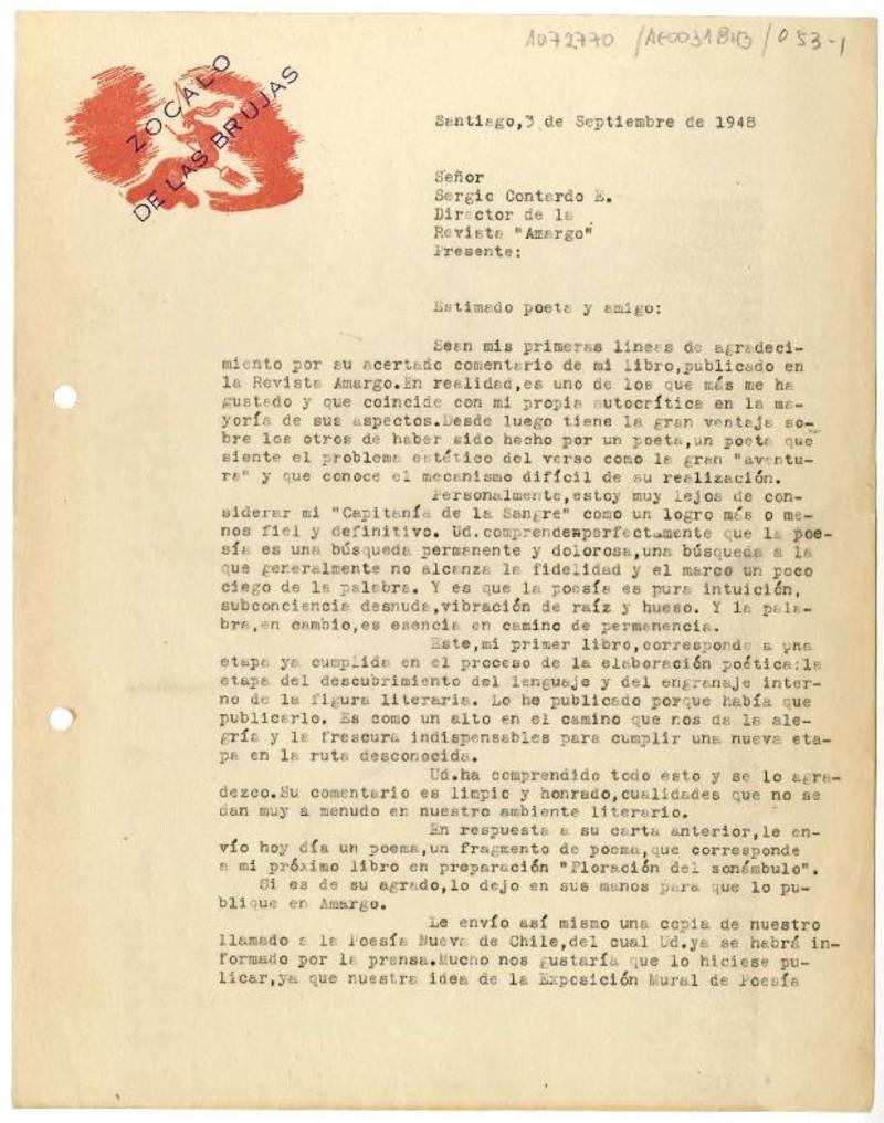 Santiago, Chile [a] Sergio Contardo Egaña. Carta, 1948 septiembre 3, [manuscrito] Mario Ferrero.