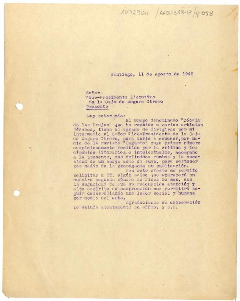 Santiago, Chile [a] Vice-Presidente de la Caja de Seguro Obrero Carta, 1949 agosto 11, [manuscrito] Mario Ferrero.