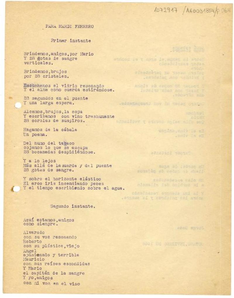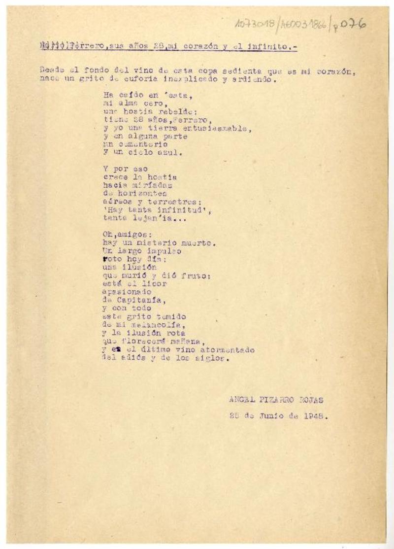 Mario Ferrero, sus años 28, mi corazón infinito [manuscrito] Ángel Pizarro.