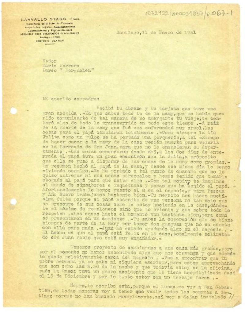 Santiago, Chile [a] Mario Ferrero Carta, 1951 enero 11, [manuscrito] Stella Díaz Varin.