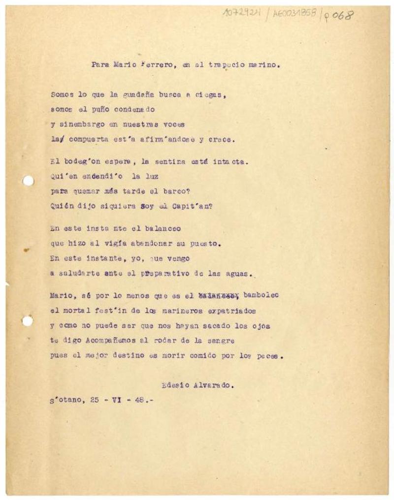 Para Mario Ferrero en el trapecio amarillo [manuscrito] Edesio Alvarado.